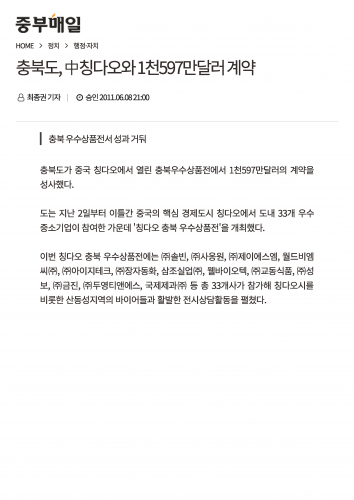 2011/06/08 (주)금진, 충북도 중국 칭다오와 1천597만달러 계약